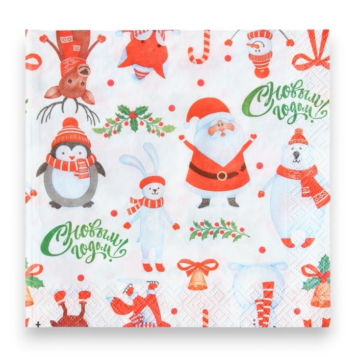 Если вы хотите, красиво и со вкусом украсить новогодний стол — салфетки с тематическим принтом обязательно займут на нём своё почётное место. Эта деталь придётся по душе всем гостям, которые непременно почувствуют праздничную и уютную атмосферу. Качественные трехслойные бумажные салфетки изготовлены из 100% целлюлозы.
