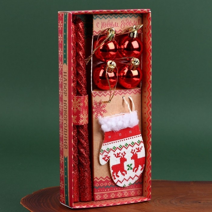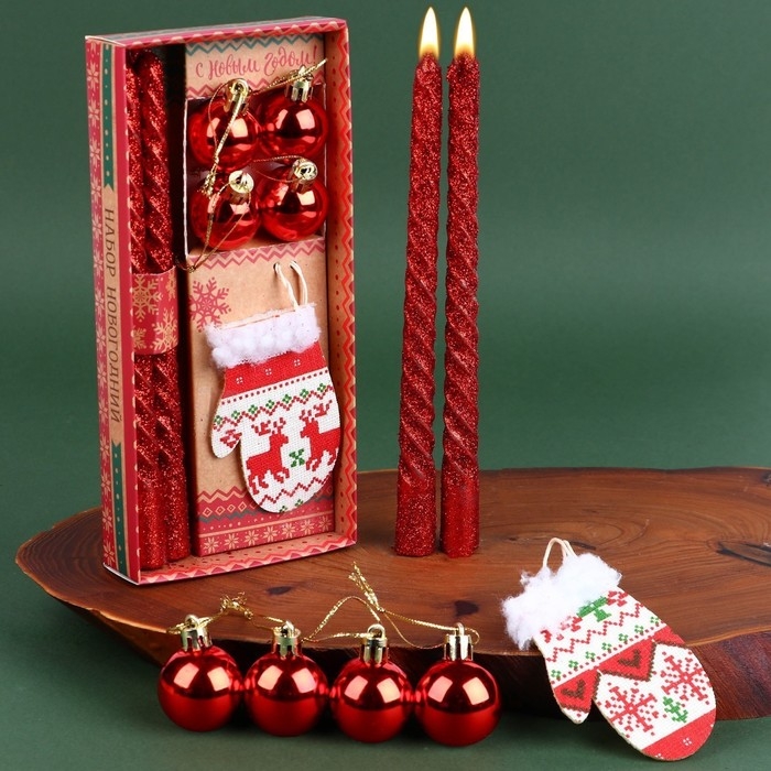 Набор витых свечей с декором прекрасно впишутся в любой новогодний интерьер и создадут праздничное настроение. Такой подарок отлично подойдет для подарка вашим родным и близким, благодаря красивой упаковке. В набор входит 2 античные свечи (1,5 х 1,5 х 20 см.), 4 елочных шара (2,5 х 3,5 см.) и подвеска на елку в виде варежки (5,5 х 0,5 х 8,5 см.)
