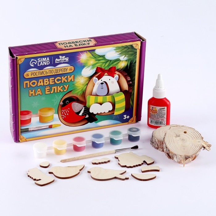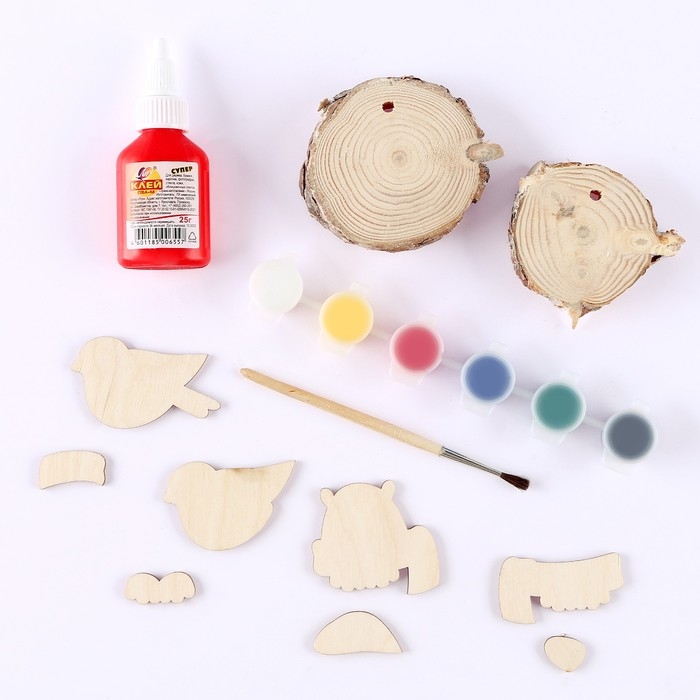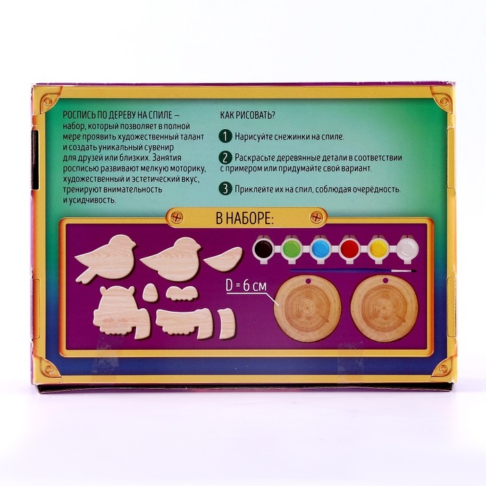 - В комплект входят деревянные заготовки, краски и кисточка.