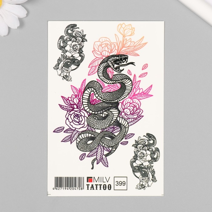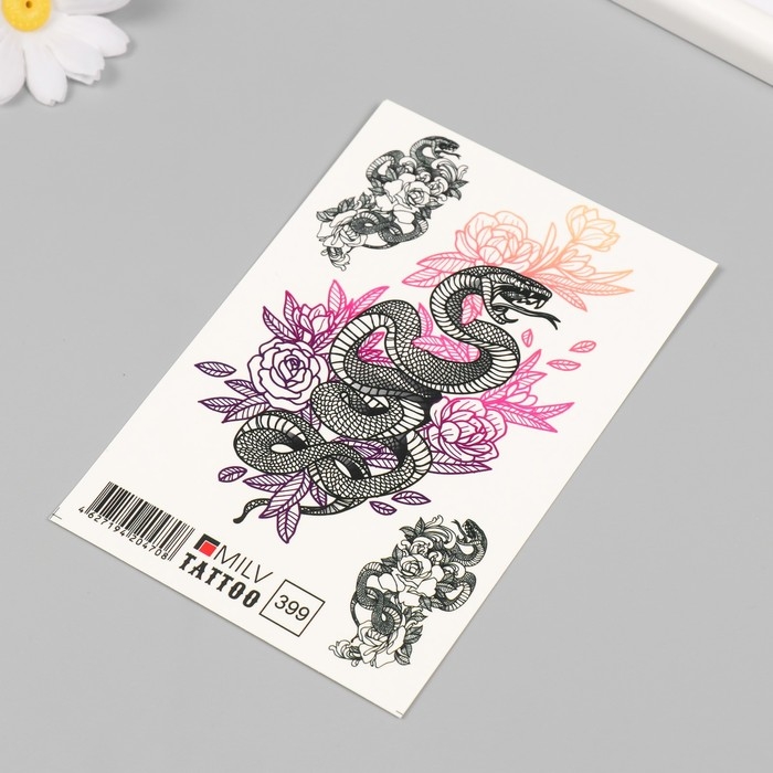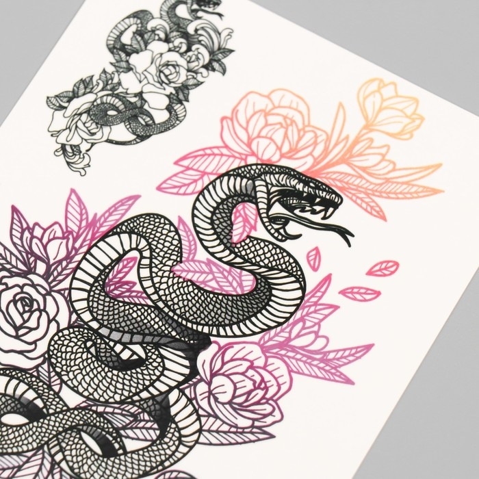 Новогодня татуировка на тело "Змея в розах" 10х15 см