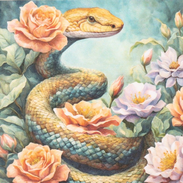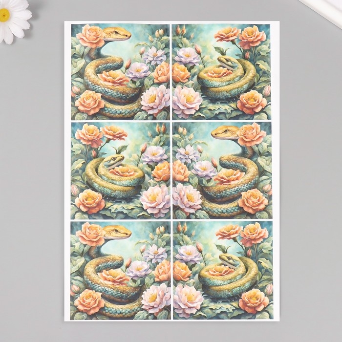 Новогодняя декупажная карта "Змея в цветочном саду", плотность 45 г/м2, формат А4