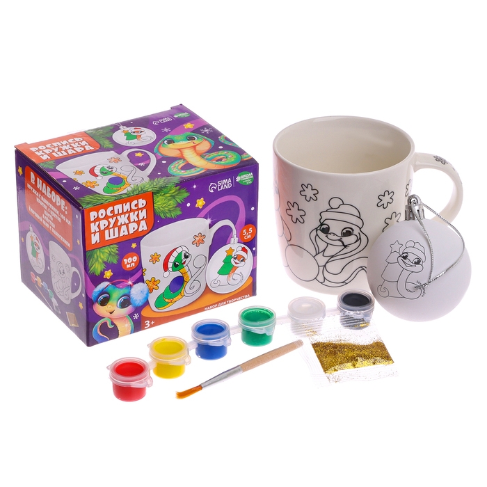 Новогодняя кружка под раскраску с ёлочным шаром «Новый год! Змеи со снеговиками», 300 мл, набор для творчества, символ года 2025