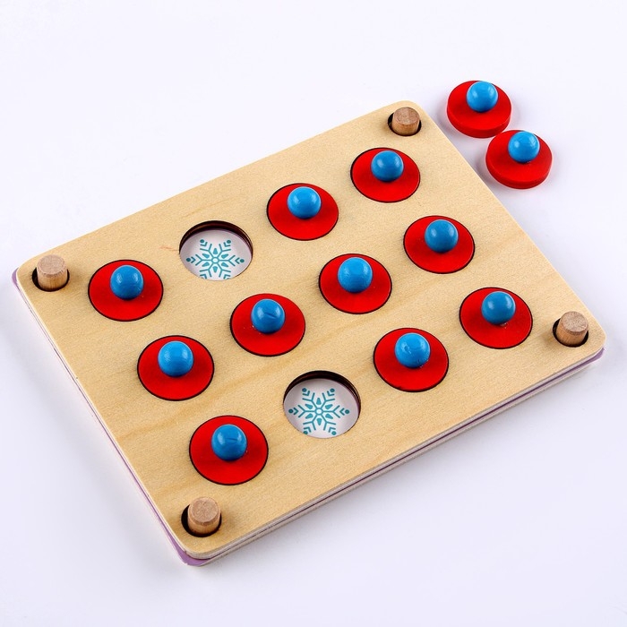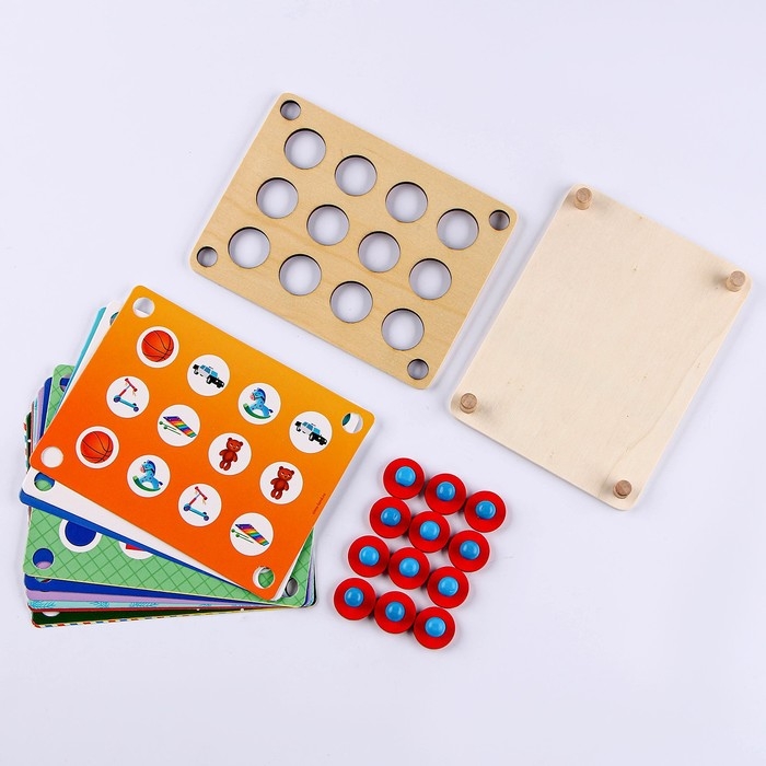 В деревянную основу надо вставить карточку. Запомнить расположение картинок. Затем расставить деревянные фишки в отверстиях, чтобы они закрывали картинки. Цель игры: найти две одинаковых картинки. Для этого необходимо поднимать деревянные фишки. Как только вы найдете подряд две одинаковые картинки, фишки с поля убираются. Если вы подняли две фишки, а картинки под ними разные, то картинки необходимо закрыть снова