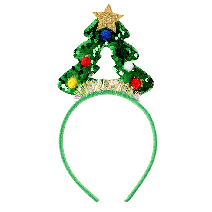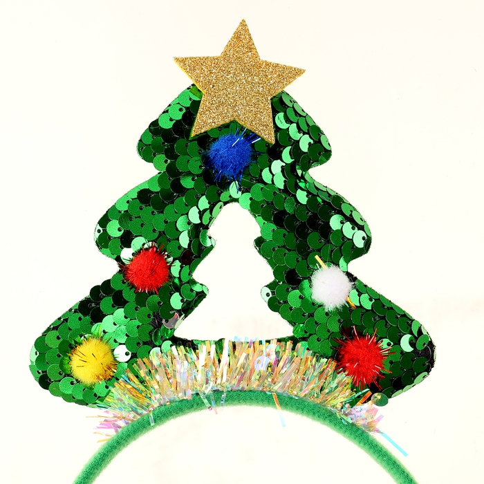 - Ободок украшен объемной елочкой, покрытой блестящими пайетками. Елочка имеет классическую форму и украшена разноцветными помпонами. Верхушку елочки венчает золотистая звезда