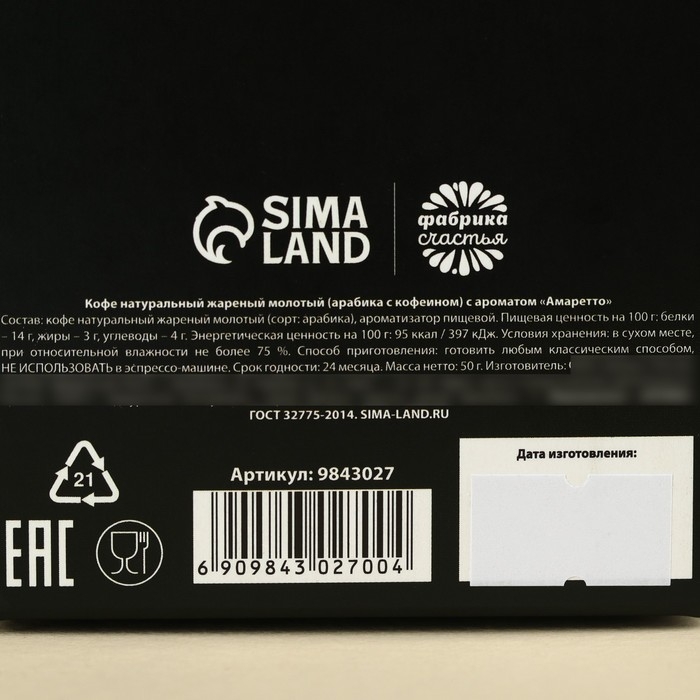 Состав: кофе натуральный жареный молотый (сорт: арабика), ароматизатор пищевой.