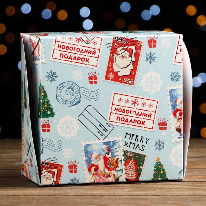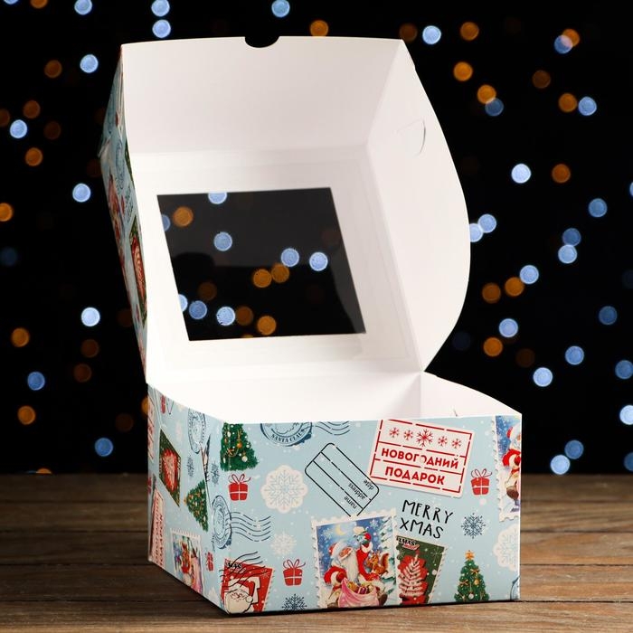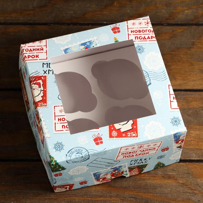 Новый год. Коробка для 4 капкейков с окном подарочная новогодняя упаковка, "Новогодняя почта", 16 х 16 х 10 см.