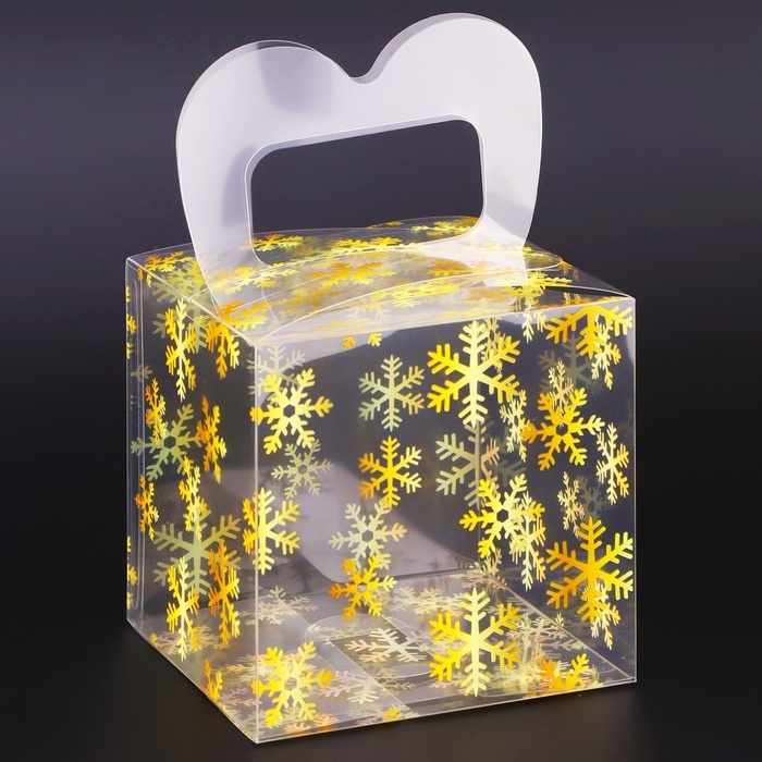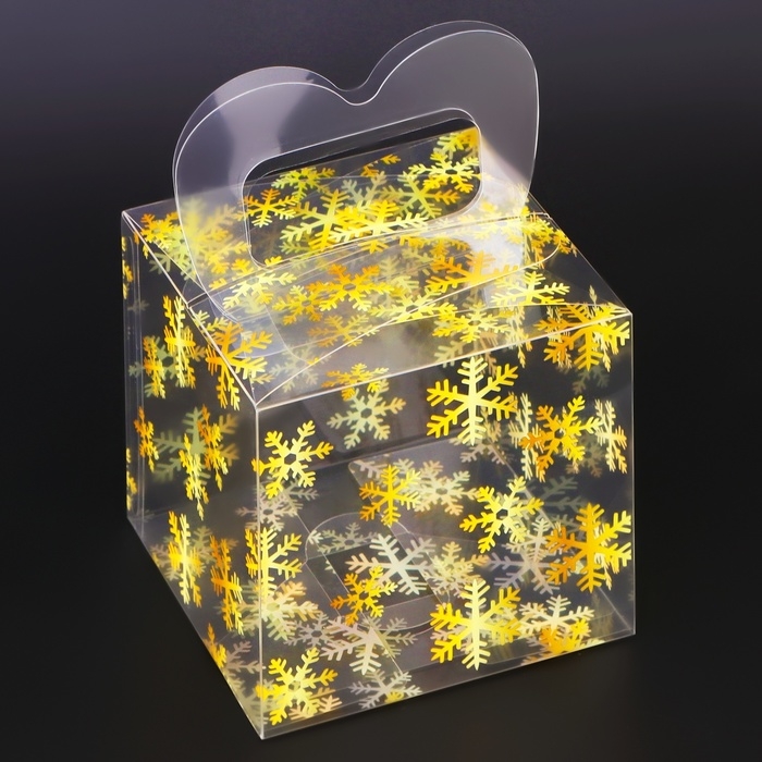 Новый год. Коробка подарочная новогодняя складная ПВХ "Снежинки" 10 х 10 х 10 см.