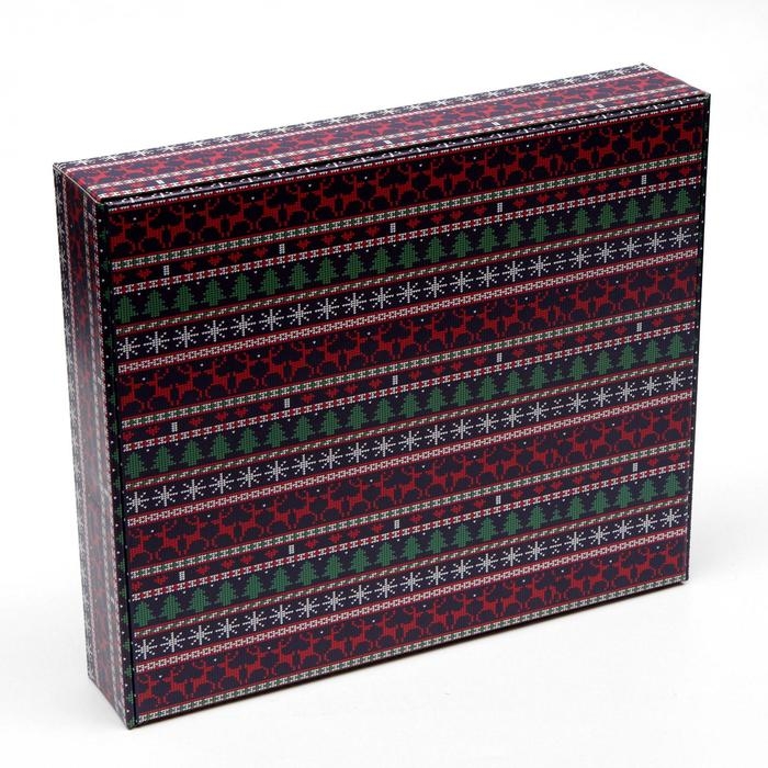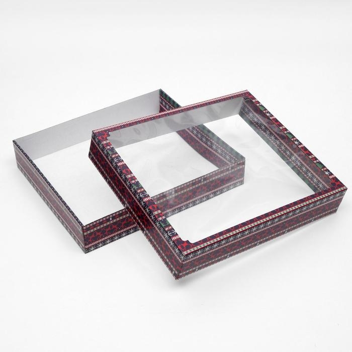 Новый год. Коробка сборная крышка-дно с окном, "Новогодний принт", 37 х 32 х 7 см.