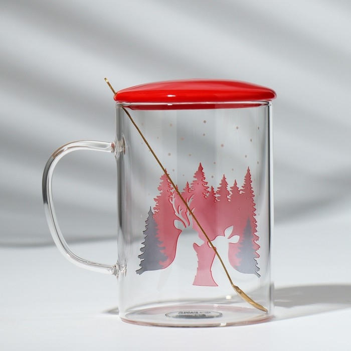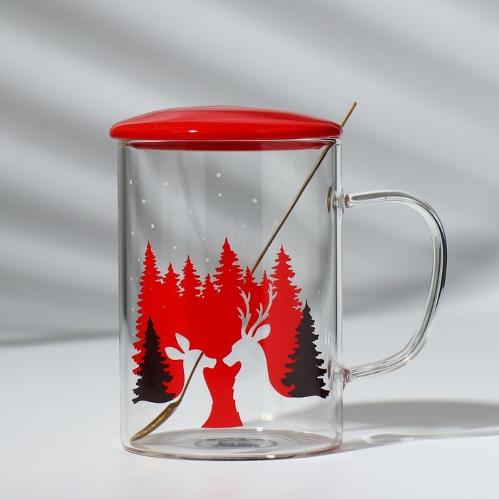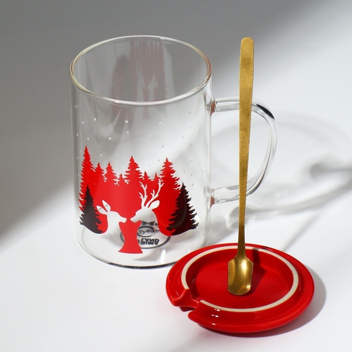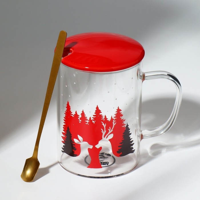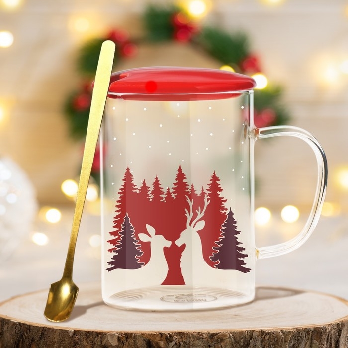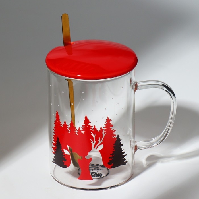 Новый год. Кружка стеклянная с ложкой и крышкой «Зимний лес», 470 мл