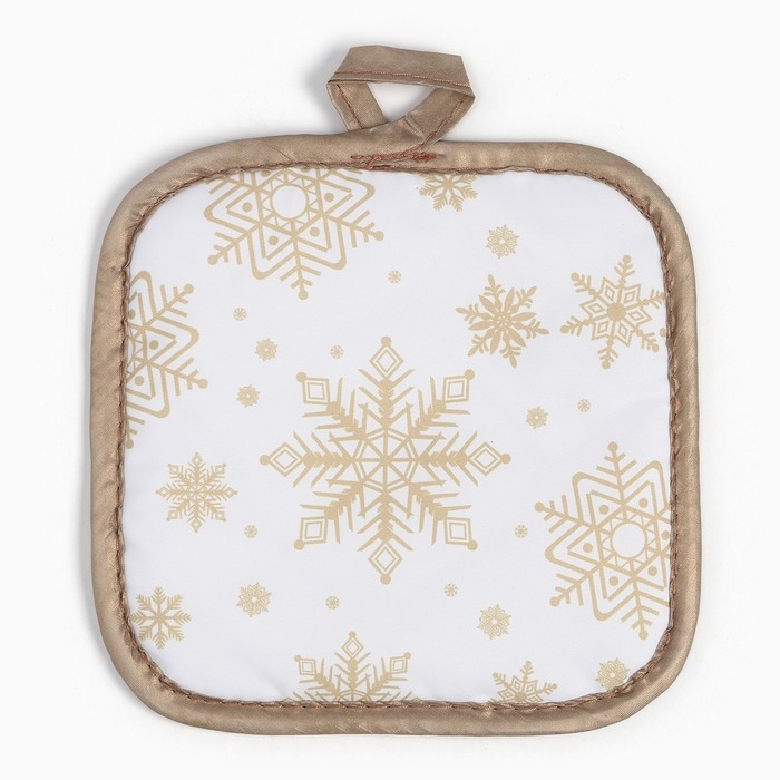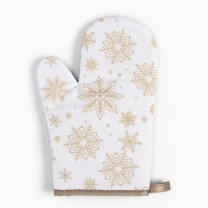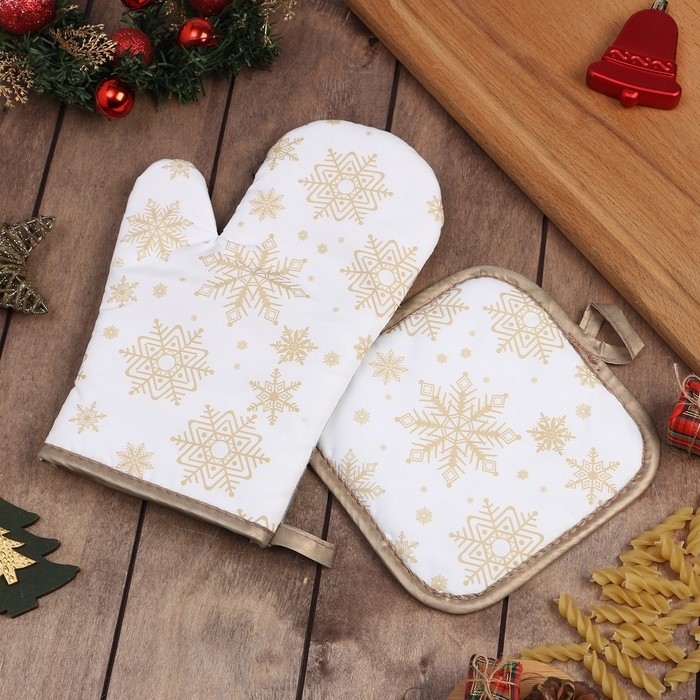 Новый год. Куханный набор 2 празмер Доляна Снежинки золотые прихватка 17*17 см, варежка 26*16 см,100% п/э