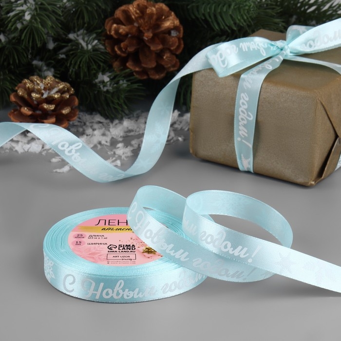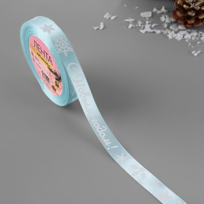 Новый год! Лента атласная «С Новым годом!», 15 мм, 23 ± 1 м, цвет голубой/белый №011