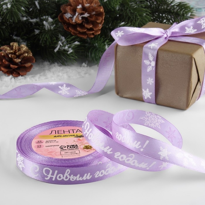 Новый год! Лента атласная «С Новым годом!», 15 мм, 23 ± 1 м, цвет сиреневый/белый №044