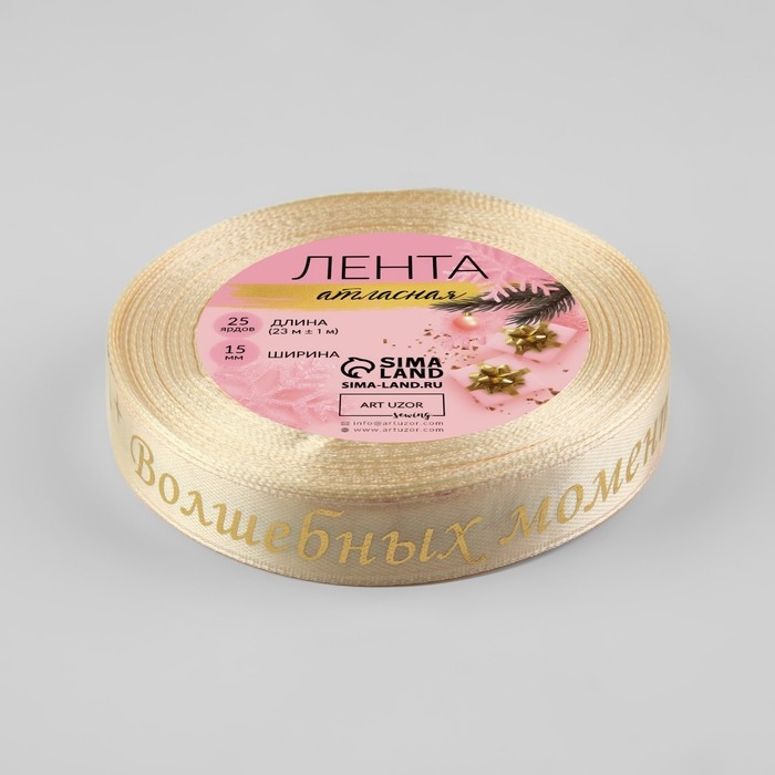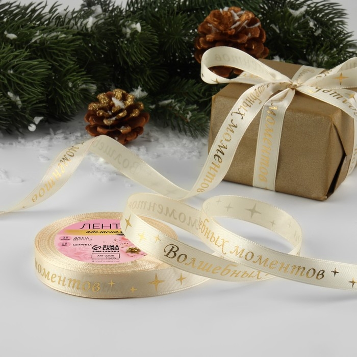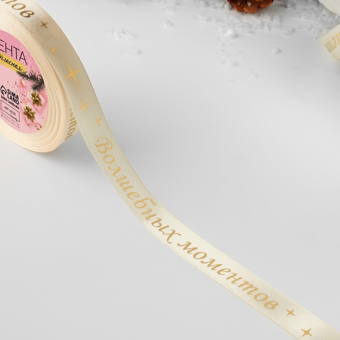Новый год! Лента атласная с тиснением «Волшебных моментов», 15 мм, 23 ± 1 м, цвет бежевый/золотой №002