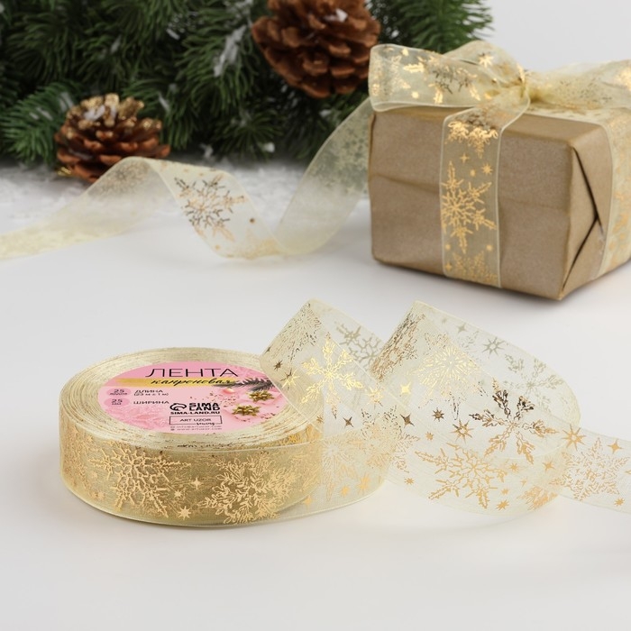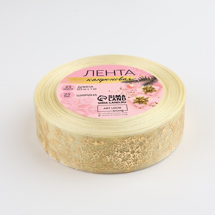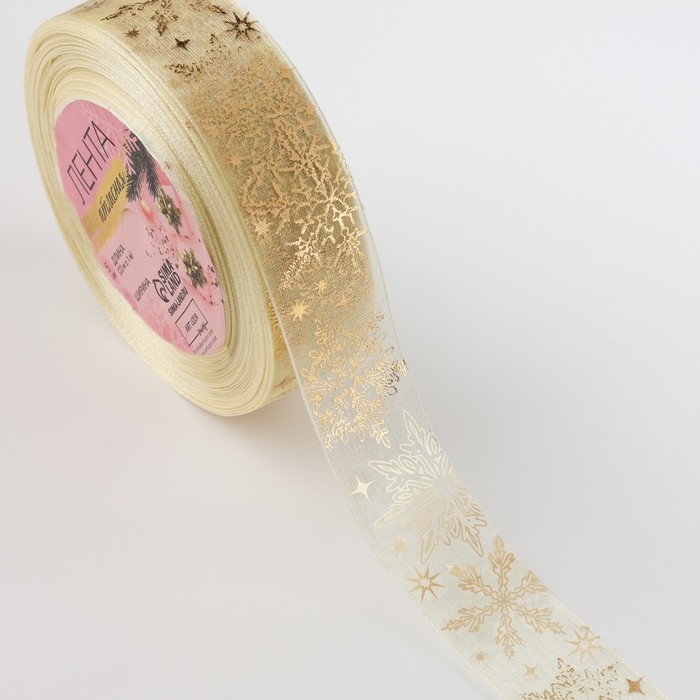 Новый год! Лента капроновая с тиснением «Фигурные снежинки», 25 мм × 23 ± 1 м, цвет бежевый/золотой