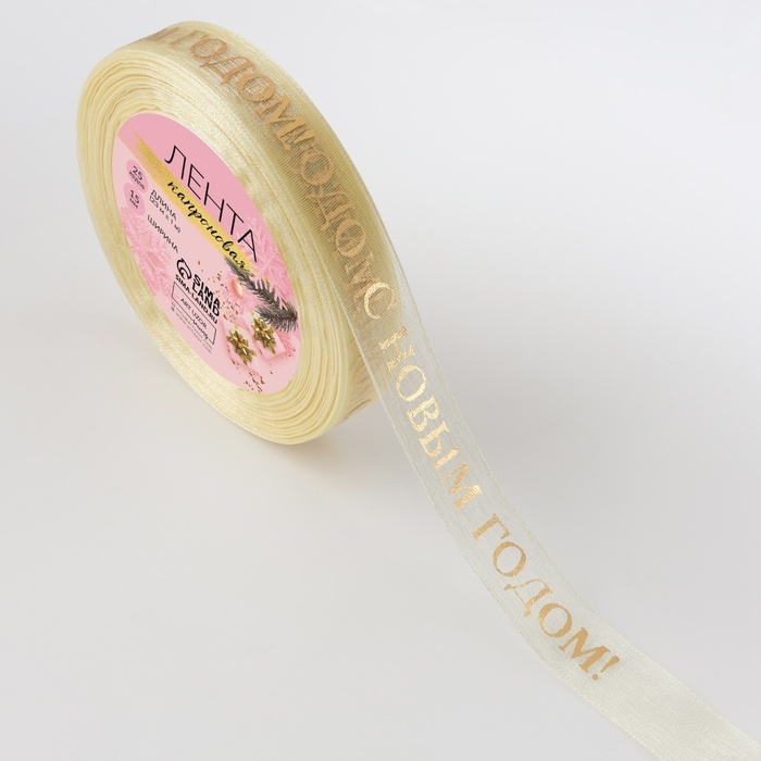 Новый год! Лента капроновая с тиснением «С Новым годом», 15 мм × 23 ± 1 м, цвет бежевый/золотой