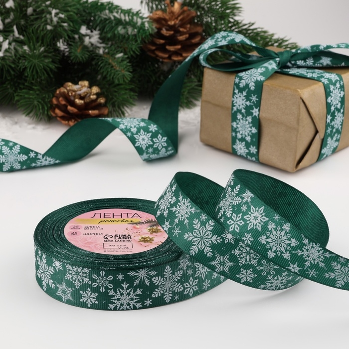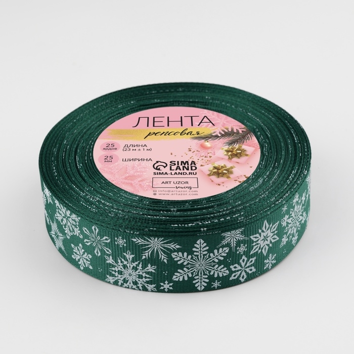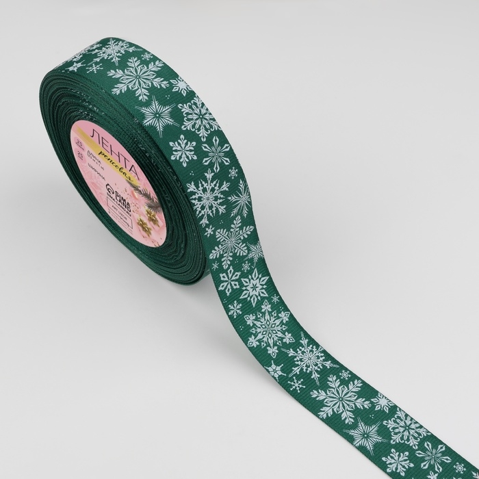 Новый год! Лента репсовая «Праздничные снежинки», 25 мм, 23 ± 1 м, цвет зелёный/белый №0119