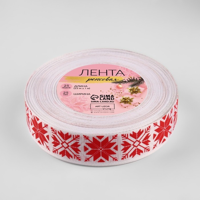 Новый год! Лента репсовая «Узорные снежинки», 25 мм, 23 ± 1 м, цвет белый/красный №1001