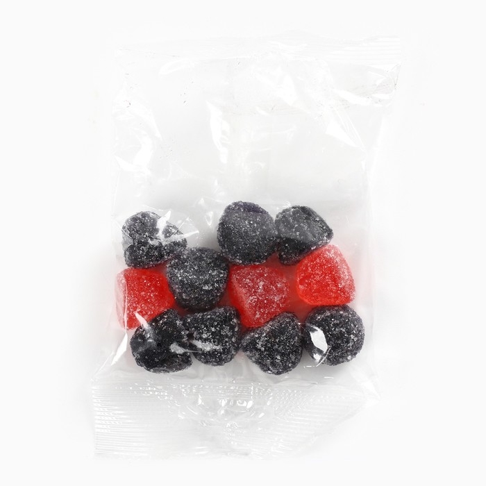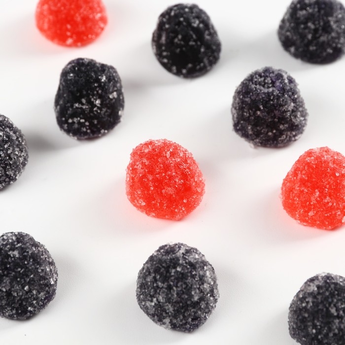 Состав: глюкозный сироп, сахар, агент желирующий – желатин, регулятор кислотности – лимонная кислота (Е330), молочная кислота (Е270), ароматизаторы: малина, ежевика, барбарис, красители пищевые: кармуазин (Е122), понсо 4R (Е124), индигокармин (Е132), чёрный блестящий PN (К151), глазирователь: растительное масло, карнаубский воск.