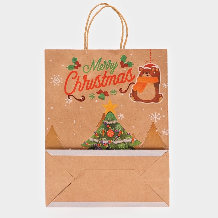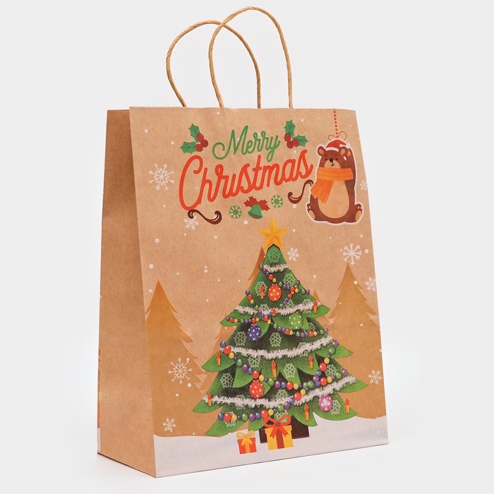 Новый год. Пакет бумажный подарочный новогодний крафт "Ёлка", 33 × 26 × 12 см.