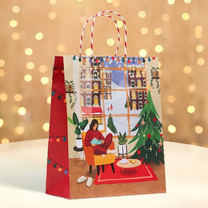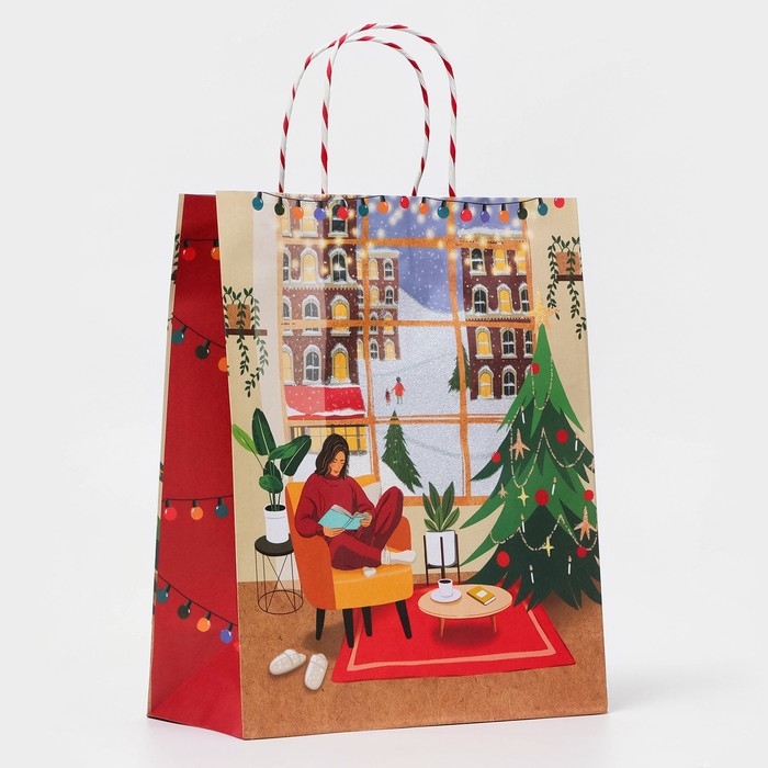 Новый год. Пакет бумажный подарочный новогодний крафт "Новогодний уют" 26 х 32 х 12 см.