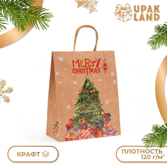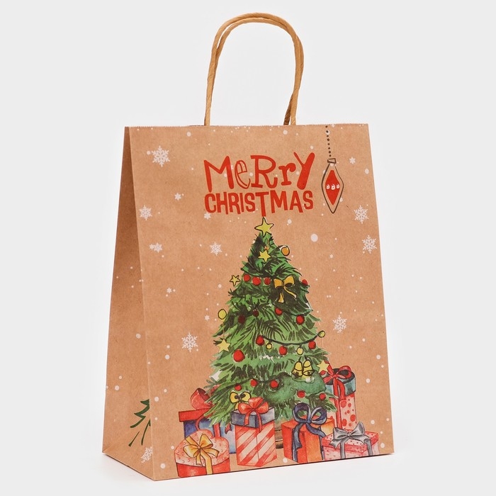 Новый год. Пакет бумажный подарочный новогодний крафт "Новогодяя ёлка", 27 х 21 х 11 см.