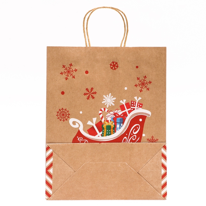 Новый год. Пакет бумажный подарочный новогодний крафт "Сани с подарками", 33 × 26 × 12 см.