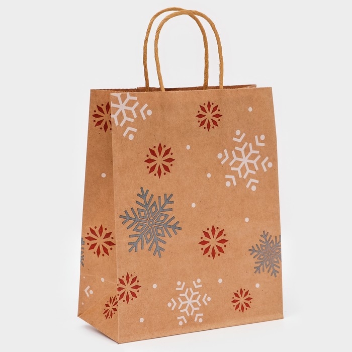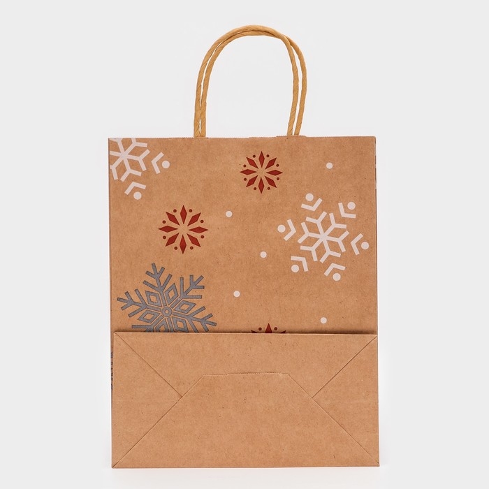 Новый год. Пакет бумажный подарочный новогодний крафт "Снежинки", 27 х 21 х 11 см.