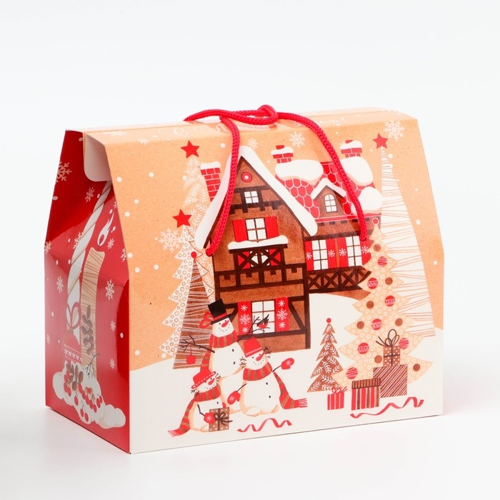 Новый год. Подарочная коробка Новогодняя Коробка-Кейс с веревочными ручками "Елочки" 20,5 х 12 х 17 см.