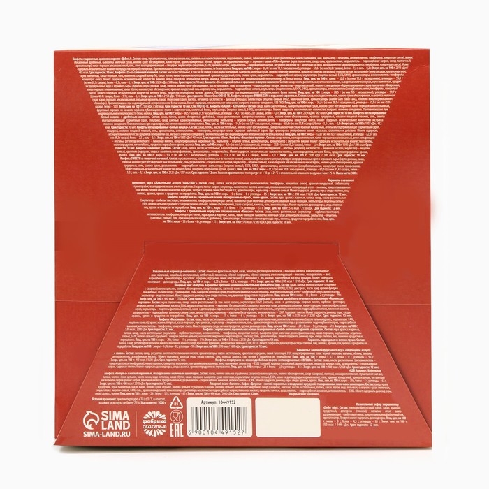 Состав: сахар, патока, масла растительные (антиокислитель: токоферолы, концентрат смеси), крахмал кукурузный, стабилизатор – гуммиарабик, влагоудерживающие агенты: сорбитовый сироп, лактат натрия; регуляторы кислотности: кислота молочная, лимонная кислота; желирующий агент – пектины, концентрированные соки яблока, чёрной моркови, красители: куркумин, экстракт паприки, синий блестящий FCF; ароматизаторы, эмульгатор – лецитин соевый. Может содержать диоксид серы, следы глютена, яиц, молока, арахиса, орехов и продуктов их переработки.