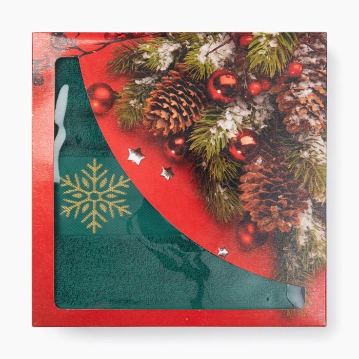 Новый год. Полотенце махровое в коробке Golden snowflakes 70х120см, цвет зеленый 360г/м хл100%