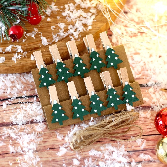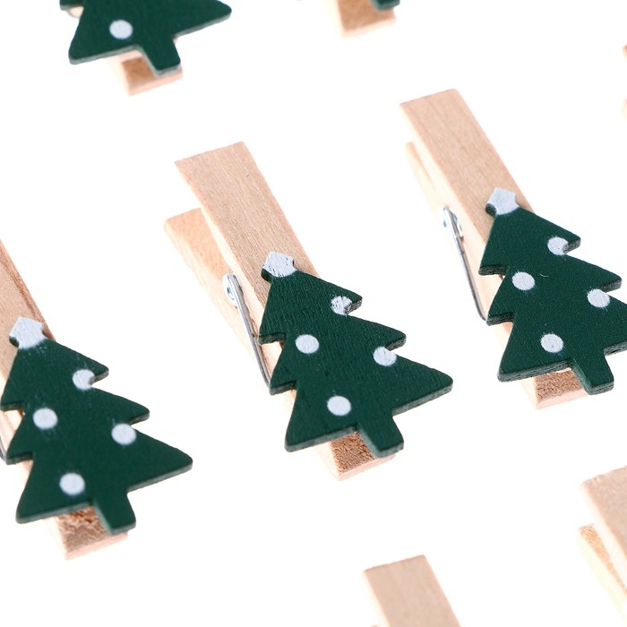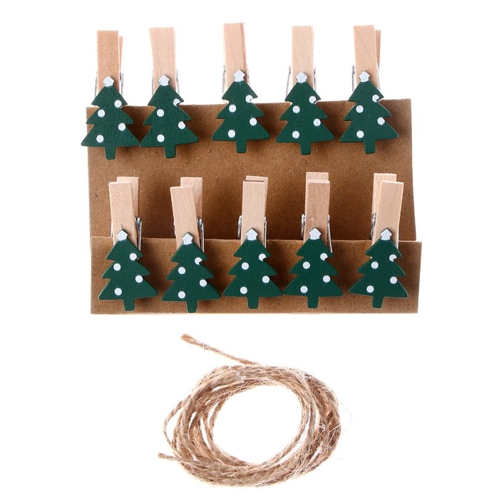 Новый год! Прищепки декоративные с верёвкой для подвеса «Ёлочки зелёные» набор 10 шт., 1,5 × 12 × 14 см
