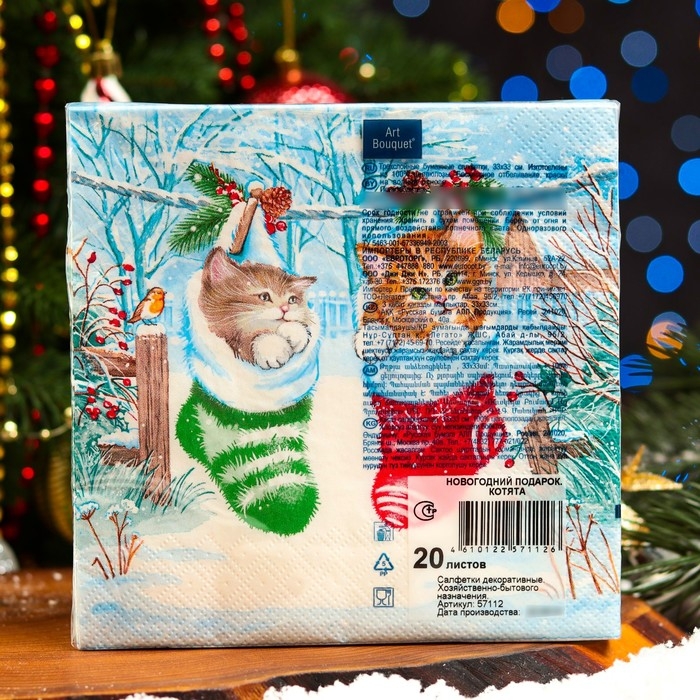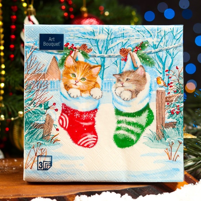 Новый год. Салфетки бумажные "Art Bouquet" Новогодний подарок Котята, 3 слоя,33x33, 20 листов