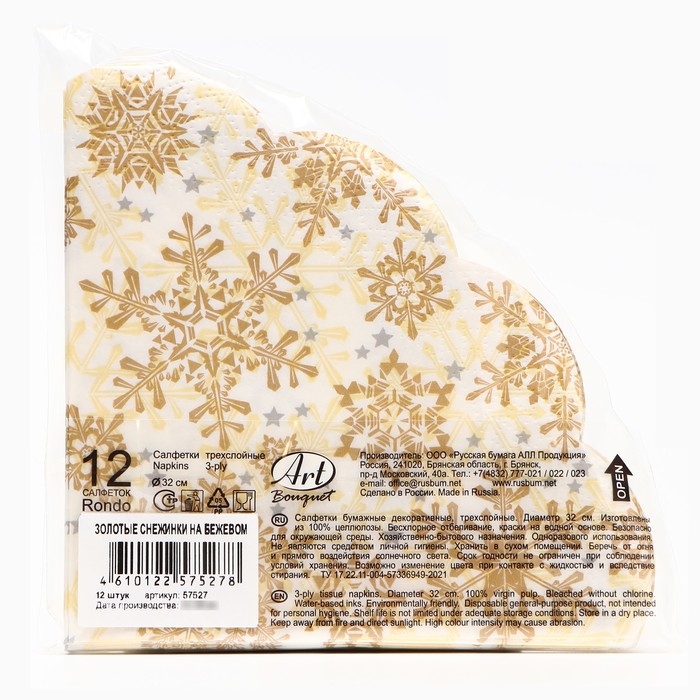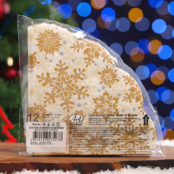 Новый год. Салфетки бумажные Art Bouquet Rondo"Золотые снежинки на бежевом", 3 слоя, d 32, 12 шт
