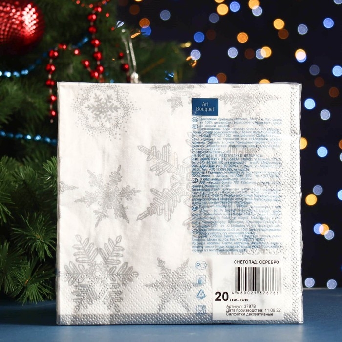 Новый год. Салфетки бумажные "Art Bouquet" Снегопад. серебро, 3 слоя,33x33, 20 листов