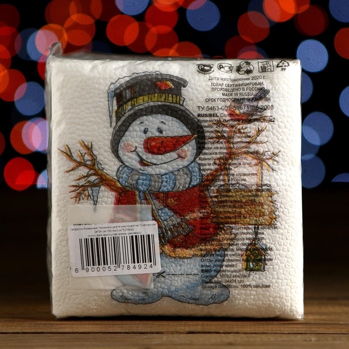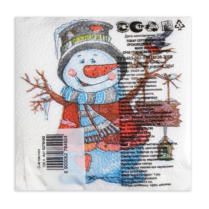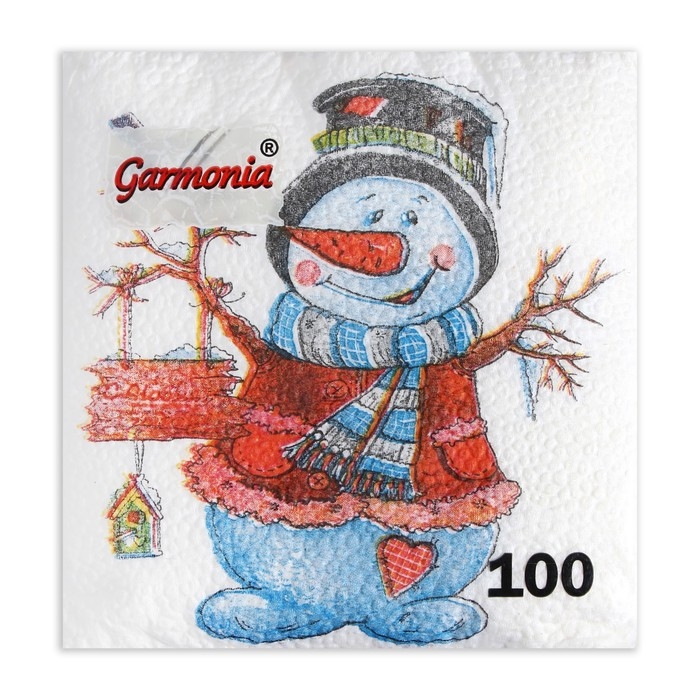 Новый год. Салфетки бумажные Гармония цвета многоцветие "Снеговичок", 24*24 см 100 листов
