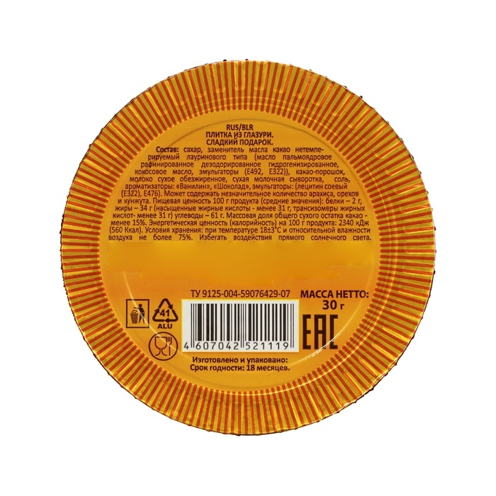 Пищевая ценность 100 г продукта (средние значения): белки - 2 г, жиры- 34 г (насыщенные жирные кислоты - менее 31 г, трансизомеры жирных кислот - менее 31 г) углеводы - 61 г. Массовая доля общего сухого остатка какао - менее 15%. Энергетическая ценность (калорийность) на 100 г продукта: 2340 кДж (560 Ккал).