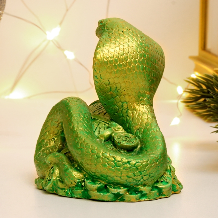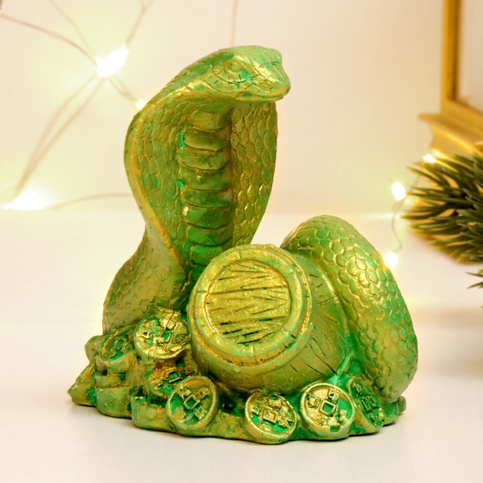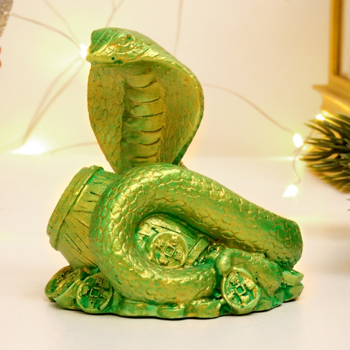 Новый год. Символ 2025. Фигура "Змея на деньгах с бочкой" зеленый с позолотой, 6х6х5см
