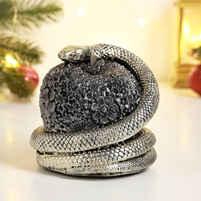 Новый год. Символ 2025. Копилка "Змея на яблоке" серебро, 10х11см