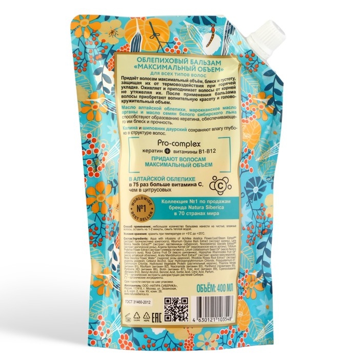 Бальзам для волос Natura Siberica «Облепиховый», максимальный объём, дой-пак, 500 мл