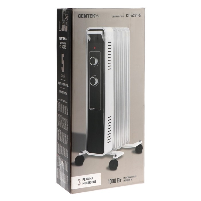Обогреватель Centek CT-6221-5, масляный, напольный, 1000 Вт, 12.5 м², 5 секций, бело-чёрный