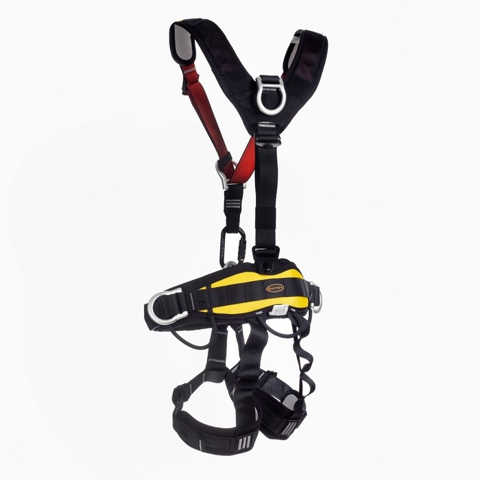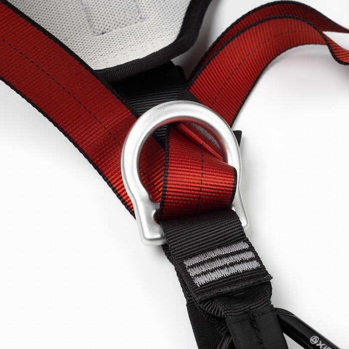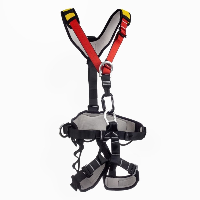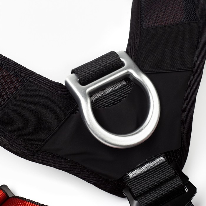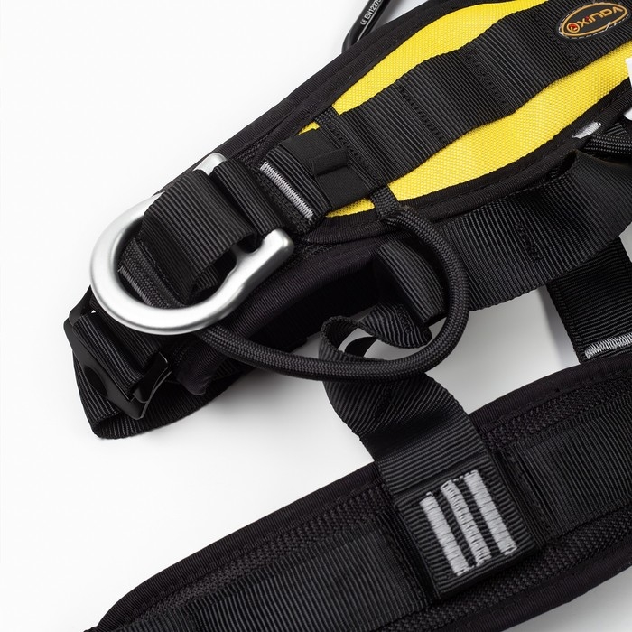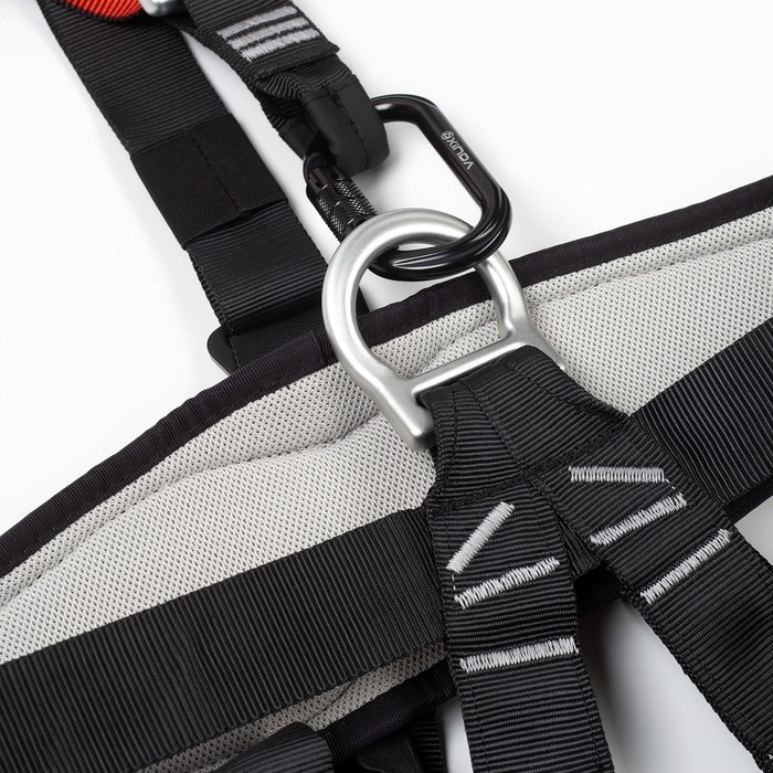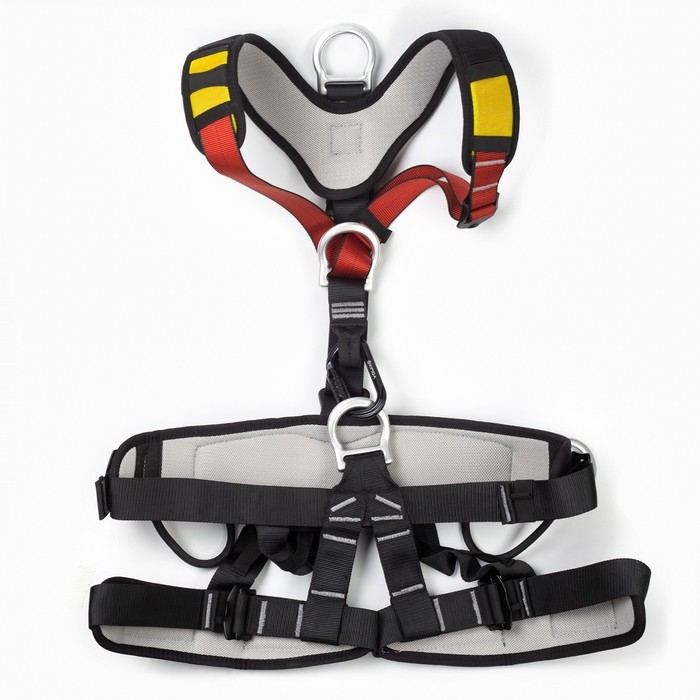 Лямки страховочного пояса регулируются, что позволяет подогнать его под любой размер и обеспечить надежную фиксацию на теле. Лямки обвязки имеют мягкую подкладку и не натирают кожу.