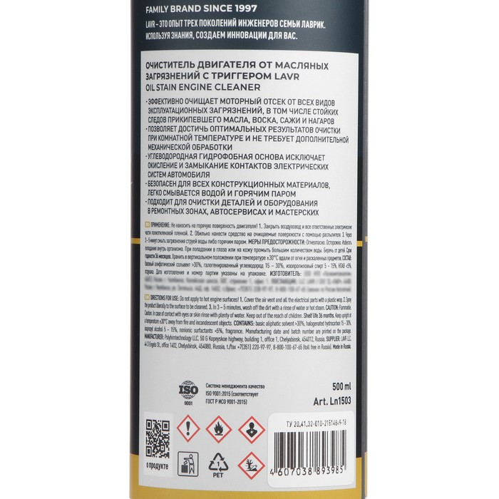 Очиститель двигателя от масляных загрязнений LAVR с триггером, 500мл Ln1503