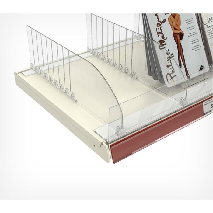 Усиленный L-образный профиль высотой 80 мм, совмещающий в себе передний ограничитель и профиль для крепления разделителей, толкателей, ребристой основы для задней опоры. Ограничитель высотой 80 мм защищает товары от падения с полки. Крепится на двухсторонний скотч.