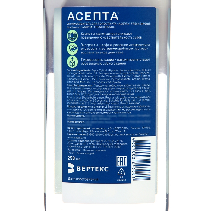 Ополаскиватель для полости рта Асепта Fresh, 250 мл
