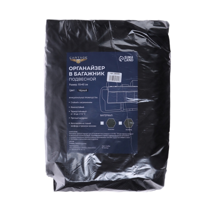 Изготовлен из прочного и долговечного материала — оксфорда, который обеспечивает надёжность и долговечность изделия. Стеганая структура придаёт органайзеру дополнительную прочность и устойчивость к износу. Сетка, которая используется в качестве разделителей между карманами, позволяет удобно организовать внутреннее пространство и быстро находить нужные вещи. Чёрный цвет органайзера гармонично сочетается с интерьером любого автомобиля и делает его стильным и функциональным элементом.