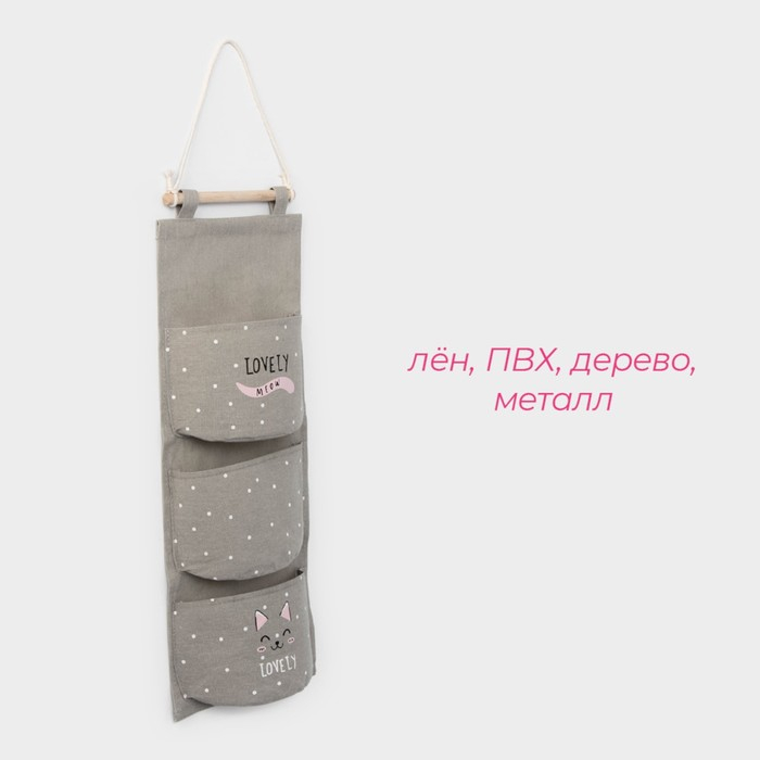 Органайзер подвесной с карманами Доляна «Котейка», 3 отделения, 59×20 см, цвет бежевый