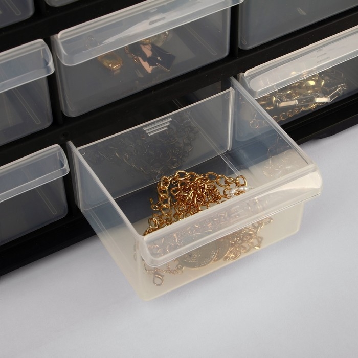 Если вы занимаетесь реализацией разнообразных украшений и аксессуаров, то вам нужно наглядно продемонстрировать свой товар, представив его в лучшем виде. Органайзер универсальный «Ящик» 39 мест, пластик, 38,5×16×47,5 см, цвет чёрный как нельзя лучше справится с этой задачей! У каждого украшения появится своё место, откуда его можно будет хорошо рассмотреть.