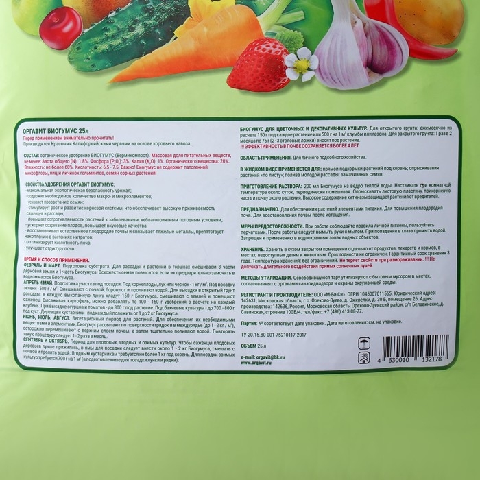 "Оргавит Биогумус" поставляется в удобной упаковке объемом 25 литров, что позволяет использовать его на больших площадях. Удобная упаковка обеспечивает удобство хранения и применения удобрения.