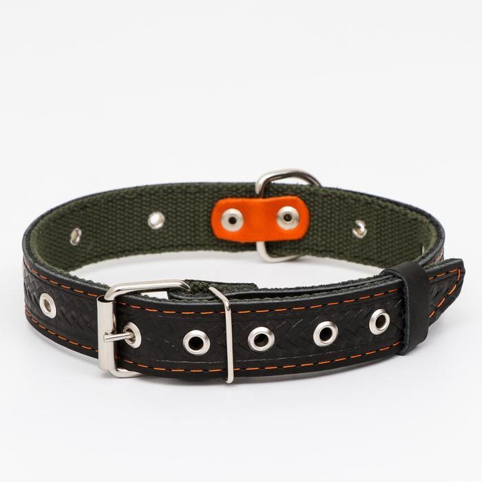 Ошейник комбинированный безразмерный, кожа/брезент, 60 х 3 см, ОШ 30-57 см, чёрный/зелёный