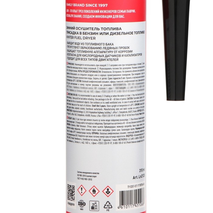 Средство от Lavr эффективно удалит воду из топлива, которая попадает в бак при заправке и возникает из-за конденсации.